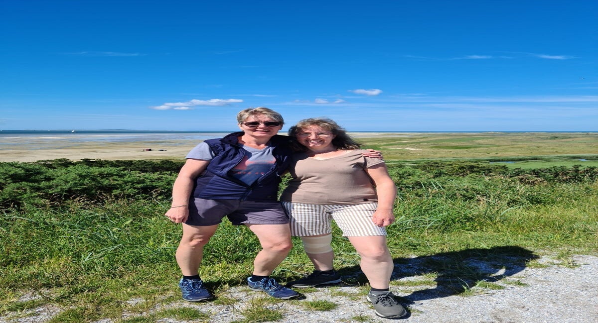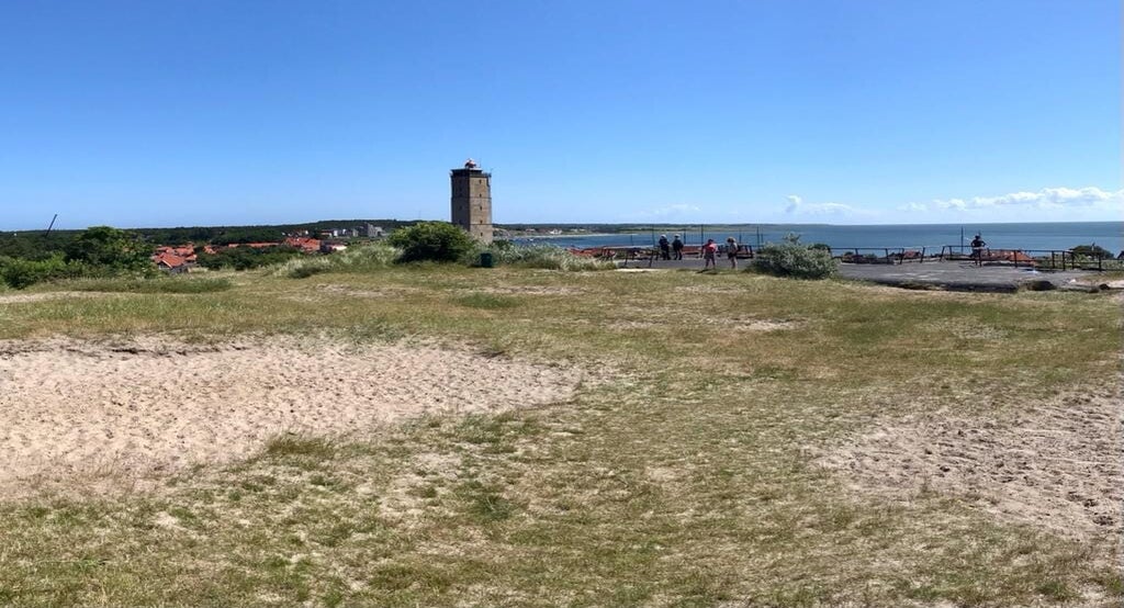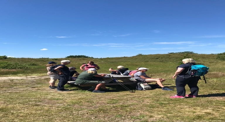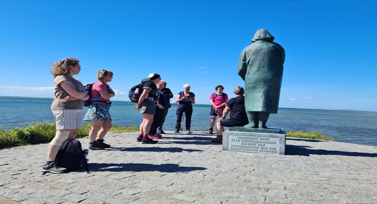Als onze koffers zijn afgegeven, lopen we naar het Zeeliedenmonument, een mens diep in de jas verscholen, kijkt uit over zee, wachtend op een dierbare die niet meer thuiskomt. We vertellen de groep hoe eervol de Terschellinger die op zee gebleven is, ieder jaar met ceremonieel wordt herdacht. We beklimmen het Seinpaalduin, die een belangrijke rol speelde in WOII en kijken uit over het Groene Strand en lopen over de bunker. Eilander fotografe Laura Conijn maakt foto's voor de Wandelzusjes-website die in aanbouw is.